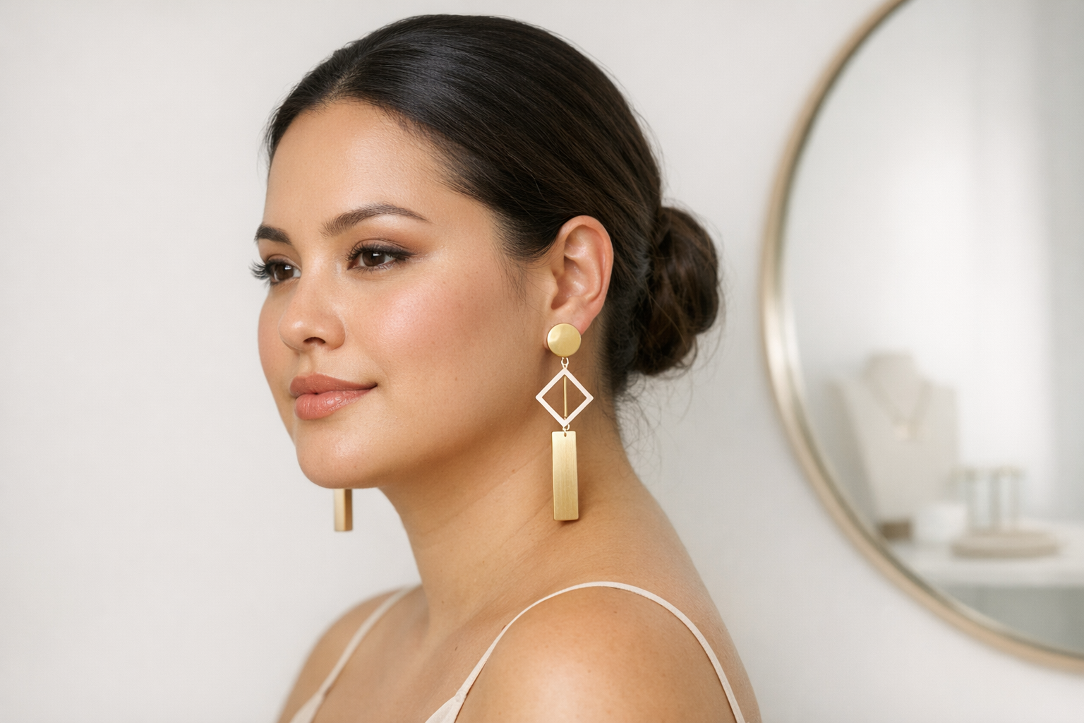 Les boucles d’oreilles longues, droites ou légèrement effilées, créent une ligne verticale qui affine immédiatement le visage. L’œil se déplace de haut en bas, oubliant la largeur.