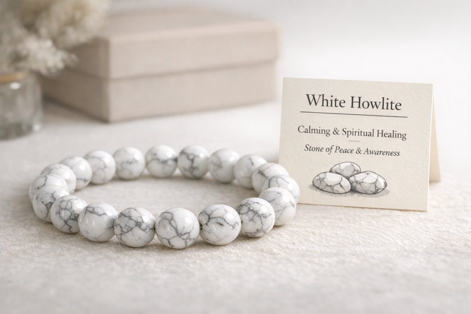 Dans le domaine de la lithothérapie, la Howlite est une pierre largement utilisée pour ses propriétés positives et relaxantes. Elle apaise l'esprit en réduisant le stress, l'hypersensibilité et l'anxiété. Elle aide à calmer l'esprit en équilibrant les émotions et en réduisant les réactions impulsives, parfois violentes.