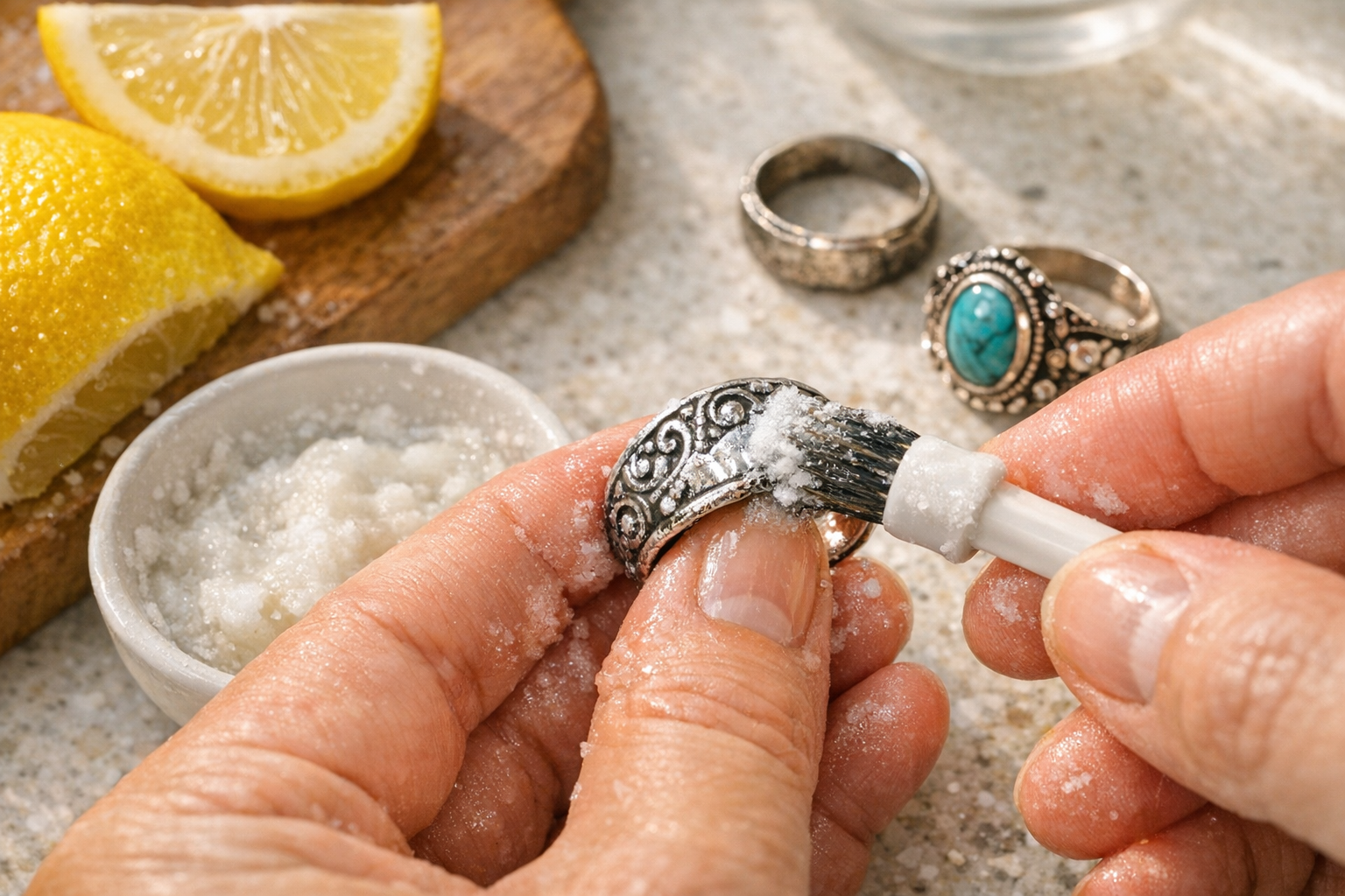 Le jus de citron est extrêmement utile pour se débarrasser des marques noires sur ce bijou. Mélangez-le à de l'eau, puis séchez et rincez. La tache a disparu.