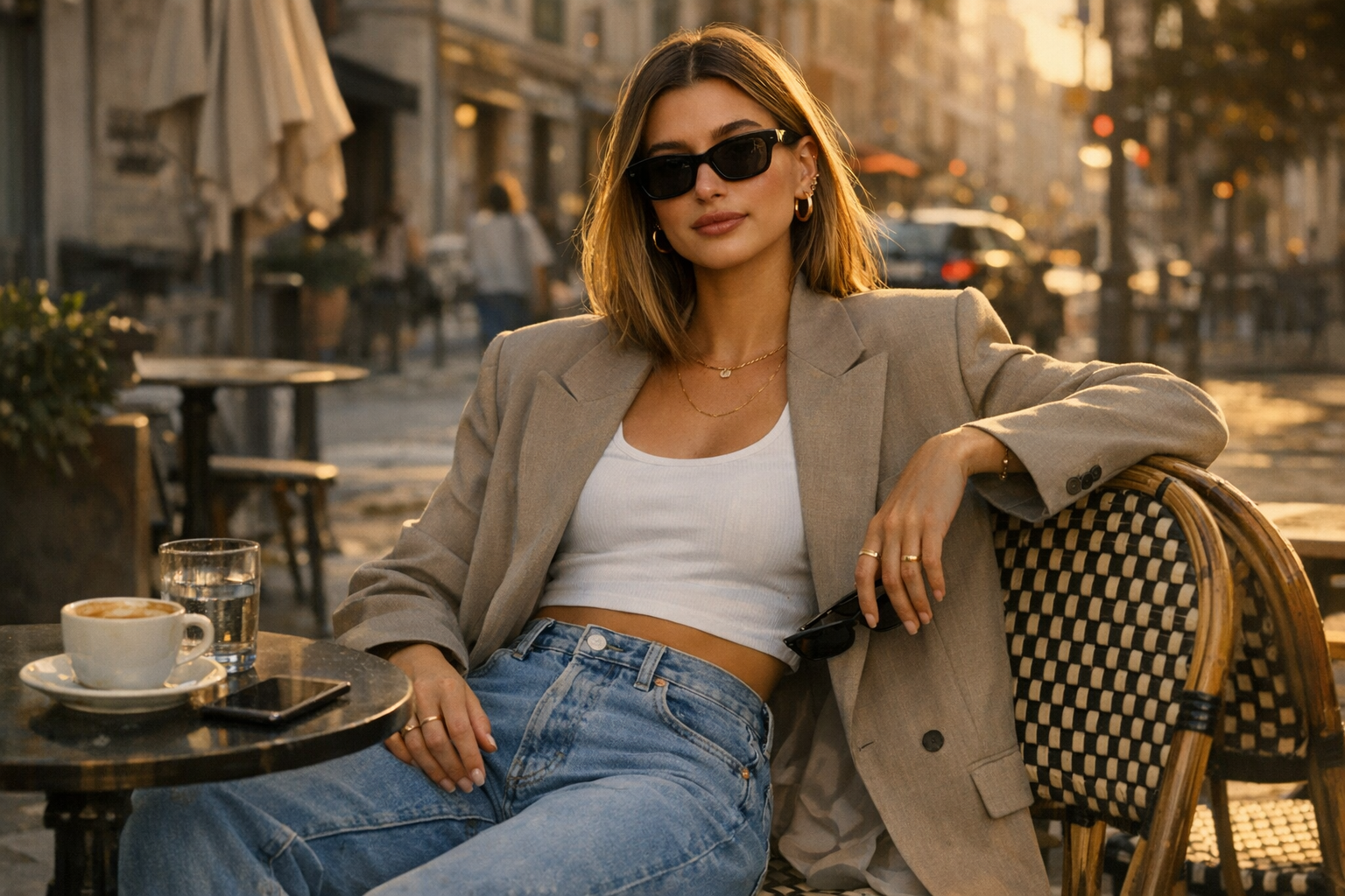 | Le style décontracté chic de Hailey: Un mélange réussi entre des pièces casual et des touches plus sophistiquées. |