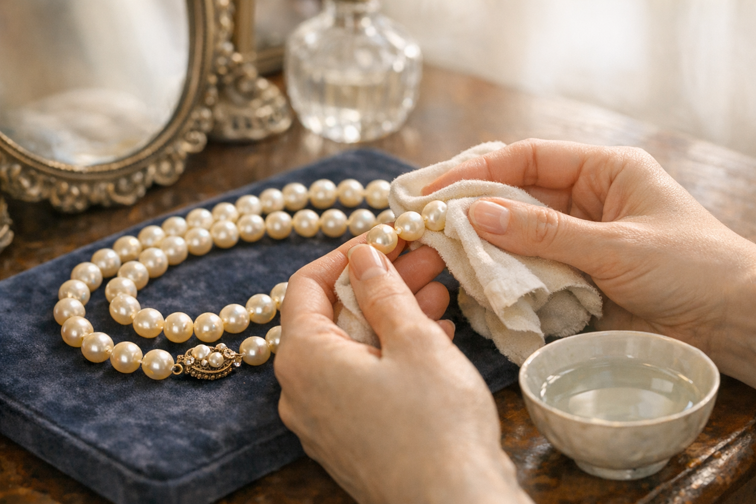 Un collier de perles anciennes ne se nettoie pas comme un bijou ordinaire. La nacre est vivante, sensible, et le temps la rend plus vulnérable aux mauvais gestes, aux produits trop forts, voire à une manipulation trop insistante.